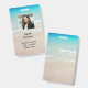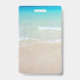 Ocean Water und Strand Szene benutzerdefinierte Abzeichen Vorlage mit Platz für Foto-ID. Das tropische Meer mit Wasser und Strand Sand ist der Hintergrund für zwei Bereiche des benutzerdefinierten Textes. Foto ist weiß gerahmt und Text schwarz. Reverse hat dieselbe Szene am Strand. Wählen Sie eine Lanyard, Clip oder schlichtes Abzeichen zu bestellen.