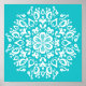 Dieses weiße Mandala liegt auf einem türkisfarbenen Hintergrund. Die Farben sind sehr beruhigend und friedlich. Teil der Sammlung Pras Mandala.