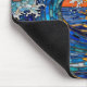 A mousepad with an illustration of a stained glass mosaic ocean waves and sunset illustration.