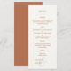 Diese mit Monogramm Karte mit schicken, minimalistischen Menüs besticht durch ein Set zeitgenössischer Schriftart in ockerfarbener Terrakotta vor einem schicken Elfenbeinhintergrund. Die Rückseite der Karte wird in derselben ockerfarbenen Farbe angezeigt. Die Vorlage enthält 4 Abschnitte zu den Mahlzeiten und Getränken. Weitere Farben sind in derselben Sammlung verfügbar.