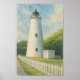 This serene watercolor captures the timeless beauty of the Ocracoke Lighthouse, North Carolina's oldest operating lighthouse. Its gleaming white taper stands gracefully against a soft, sun-dappled sky, radiating a sense of peaceful enduring strength. A classic white picket fence guides the eye along a weathered boardwalk, leading to the lighthouse and its small, accompanying white structure. Lush green trees provide a verdant backdrop, enhancing the tranquil atmosphere. This piece beautifully evokes the quiet charm and historic allure of Ocracoke Island, a true coastal treasure.