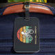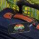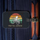 Ein weißer Oktopus mit großen, runden Augen wird beim Fahrradfahren vor einem Hintergrund des Retro-Sonnenuntergangs dargestellt. Der Sonnenuntergang ist mit einem mehrfarbigen, mehrschichtigen Design in Rot-, Orange-, Gelb- und Grüntönen gestaltet, was ihm ein Vintages Ambiente verleiht. Die Tentakel des Oktopus sind fasziniert gezeichnet und umhüllen die Lenker und Pedale des Fahrrads.