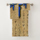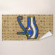 Serviette de bain sertie avec le symbole de l'Egypte ancienne, l'oeil Horus sur Hiéroglyphes. Ce design présente l'oeil Horus en bleu, jaune et noir contours sur un arrière - plan de Hiéroglyphes.