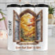 Diese Grafik zeigt ein gewölbtes, offenes Fenster mit einem steinernen Rahmen. Hinter dem Fenster bietet sich ein landschaftlicher Blick auf die Bäume im Herbstblumen mit lebhaften Blätter in Gelb, Orange und Rot. Die Worte "Ihr Herz Ihm öffnen" werden unter dem Bild in einem warmen, handgeschriebenen Schriftart geschrieben.