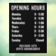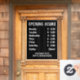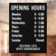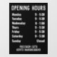 Öffnungszeiten Fenster für einen Shop anzeigen. Ändern Sie die Details, wie Sie möchten. Zeigt bis zu 7 Tage und Öffnungszeiten an. Schwarz und Weiß.