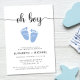 Niedliche Baby Boy Dusche Einladung mit "oh boy" in einem stilvollen Drehbuch mit Wimpern und einer pastellblauen Aquarellfarbe von Babyfüßen. Unterhalb können Sie die Duschdetails ganz einfach personalisieren.