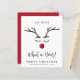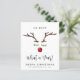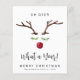 Eine lustige, preisgünstige Ferienkarte mit "Oh Deer, What a Year!" in einfacher Typografie und einer stilvollen Schrift, eine abstrakte Aquarellfarbe eines Rentiers mit Geweih, grüne Blätter für die Wimpern und eine rote Beere für die Nase, "Frohe Weihnachten" und Ihr Familienname und das Jahr. Auf der Rückseite können Sie eine Nachricht mit Ihren Vornamen in Weiß vor einem roten Hintergrund personalisieren.