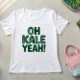 Dieses Bild zeigt einen weißen T - Shirt mit dem Text "OH KALE YEAH!", der in fett und grün gedruckt ist. Die Buchstaben sind mit grünen Texturen stilisiert und ähneln dem kale. Das "O" oben ist größer und hat ein komplizierteres Laubmuster.