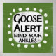 Un dessin typographique irrévérencieusement bizarre qui dit "Goose Alert, Mind Your Ankles". Il présente du texte noir et rouge sur un rectangle blanc avec des points blancs amusants et amusants qui l'entourent, le tout sur un arrière - plan gris.