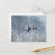Paire d'oies grises qui volent devant la carte postale des roseaux enneigés.