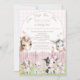 This adorable pink farm birthday invitation features sweet watercolor barnyard animals wearing bows, a pink fence, and soft gingham background — perfect for a little girl’s barnyard or petting zoo party theme.