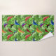 Ce kit de serviettes est doté d'un linge bleu, d'une serviette de bain bleu foncé et d'une serviette de bain aux motifs naturels d'oiseaux en feuille.