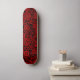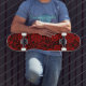 Ein Skateboard mit interessantem und abstraktem Design, bestehend aus verschiedenen runden Formen in verschiedenen Stilen verbunden durch dünne Linien wie ein Netzwerk oder ein Ökosystem.