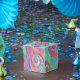 lustige Papierbox mit einem Bild eines großen lila Oktopus auf einem aquamarinen Hintergrund.
