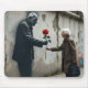 Eine ältere Frau streckt ihre Hand auf ein Wandgemälde eines Mannes aus, das eine lebendige rote Rose an einer verwitterten Wand bietet