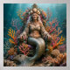 An elderly mermaid sits regally on an ornate throne surrounded by colorful coral. Her expression is dignified, and she wears intricate jewelry.
