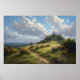 Ölgemälde eines gewundenen Weges, der auf einen Wiesen-Hügel hinaufgeht, in Richtung eines Felsausschnitts, auf dem eine alte Hütte aus Stein mit einem herrlichen Blick auf eine weite Weide von Wäldern und Farmen unten steht. Mit generativen Algorithmen und Fotoshop erstellt. Das ist ein weiteres 100% originelles Schnürhammer Design.