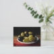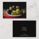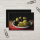 Diese Kunsthandwerkskarte bietet eine interessante Auswahl an köstlichen Oliven, darunter Picholine, Nicoise, Kalamata, grüne Cerignola und schwarze Cerignola. Sie sind in einer weißen Schale auf einer bunten, gewebten roten, gelben und grünen Matte auf einem schwarzen Hintergrund angeordnet, um eine künstlerische und mündige noch lebendige Komposition zu erhalten.