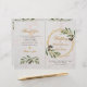 Ein gefaltetes Hochzeitsprogramm, das mehrere Trends kombiniert: geometrisch, Marmor und metallisch (vergoldet). Der Hintergrund ist aus weißem Marmor. Es hat Olivenzweige mit grünen Blätter und schwarzen Oliven als Dekoration und ein unregelmäßiges goldenes Hexagon um den Text auf der Vorderseite, mit Olivenzweigen darüber, rechts und unten verlassen. Es gibt auch ein Paar Olivenzweige in der Nähe der oberen Grenze und unter dem bedankenden Text auf der Rückseite. Die Titel und die Namen der Braut und des Bräutigams sind in einer goldenen, eleganten Kalligraphie geschrieben. Es hat die Hochzeitsfeier und die Hochzeitsfeier im Inneren und ein Dankeschön an Sie auf der Rückseite, mit einem kleinen goldenen Herz über den Namen. Der Olivenzweig stammt aus einer botanischen Illustration - "Olivenbaum" - aus der Publikation "The North American Sylva, Vol. II - 1841-1849", die jetzt öffentlich zugänglich ist.