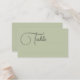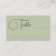 Hübsche flache Hochzeitsbegleithkarten in olivgrün mit einem Tisch in einem hübschen Skript mit einem großen T. Schreib Tischnummer und Name von Hand.