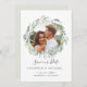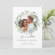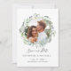Elegante botanische speichern Sie die Daten mit einem bevorzugten Verlobung Foto umgeben von einem runden Kranz von Oliven und Blätter in einer eleganten Aquarellpalette von Grauen und Grün Personalisieren mit Ihren Namen, Hochzeitstag und Lage.
