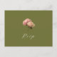 Carte postale chic et moderne que les clients peuvent vous envoyer avec leur RSVP. Cette carte postale RSVP de mariage rose présente des accents roses vintages et un ensemble de polices contemporaines en vert olive, contre des arrière - plans d'olivier et de blanc.