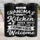 Diese wunderbare Grafik feiert Familienwärme mit dem einladenden Satz "GRANDMA'S Kitchen MADE WITH LIEBE GRANDKIDS Welcome" in knackiger, weißer Schrift vor schwarzem Hintergrund. Charmante Küchensymbole wie z.B. ein rollendes Button, Whisk, Spatel und Messer sind spielerisch integriert. Herz bedeutet Zuneigung und schafft ein herzzerwärmendes Design für den Kochraum einer gepflegten Oma.
