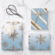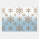 Hübsche Goldschneeflocken auf einem farbenfrohen, blauen und weißen Hintergrund.