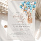 On Peut Attendre ! :) Ce petit ours attend la grande fête du bébé, assis dans une montgolfière construite en ballons bleus, bruns et crème. Des aquarelles fantaisistes et une typographie moderne complètent le design. Personnalisez cette invitation à Baby shower d'ours mignonne avec vos détails de baby shower facilement et rapidement, appuyez sur le bouton customiser pour réorganiser davantage, et formater le style et le placement du texte.