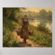 A woman in traditional attire is seen carrying two buckets of water along a scenic riverside path. The lush greenery and wildflowers create a serene atmosphere.
