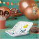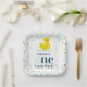 "One Lucky Duck" erste Geburtstagsparty Thema mit Gummiente umgeben von Konfetti, Blasen und blauen Text.