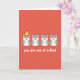 This greeting card shows four cute cartoon hamsters lined up on a coral background. Each hamster is soft gray with a white belly, and they hold their small pink paws up near their chest. Their faces look happy and friendly, with big dark eyes, tiny whiskers, and open smiles that show little pink tongues. The hamster on the far left wears a bright yellow party hat with a zigzag pattern and a red pom-pom on top, which makes it stand out from the others. Under the hamsters, the text reads “you are one of a kind” in rounded white letters. The message sits along the bottom area and feels simple, sweet, and personal. It’s a warm card for romance, friendship, or anyone you want to make feel special ❤️💌🍫. Hope it helps you share your Valentine’s Day feelings with someone you care about.