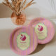 A charming pastel birthday design featuring a sleepy pink cat in a tiny party hat, framed inside a soft cream label with mint green bow details. The pink-and-yellow striped background adds a cheerful retro touch.
