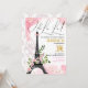 Belle invitation d'anniversaire avec un thème parisien qui comprend un arrière - plan d'aquarelle rose à la fleur de lis et la Tour Eiffel habillée d'un arc rose aux fleurs de cerises et d'une branche en feuilles vertes. Le texte du support de la police de caractères noir, rose et or est facilement mis à jour avec vos détails. "Ooh La La !" en gras texte en haut ajoute à l'excitation.