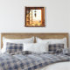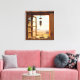 A rustic window with wood windchimes hanging looking out a desert canyon scene.