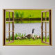 Schöne Aquarelldarstellung einer Mutter Kanadische Gans und ihrer Küken, auf dem Rasen neben dem See, außerhalb dieser gemütlichen offenen "Fenster" Ansicht.