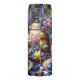 Diese skurrile Abbildung zeigt ein niedliches Opossum, eingebettet in einen großen, verzierten Teakup mit saftigen Heidelbeeren. Der Teekessel sitzt auf einer Untertasse inmitten verstreuter Heidelbeeren auf einem karierten Tischdecken. Eine Teekanne und eine Zuckerschale befinden sich in der Nähe, umgeben von üppig violetten Blumen und lebhaften Bienen, was ein köstliches, fantastisches Party im Garten verspricht.