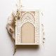 Erleben Sie den Inbegriff der Eleganz mit dieser opulenten islamischen Hochzeitseinladung, die die Grandeur von Gold und die Reinheit von Sahne faszinierend verbindet. Die Vorderseite zeigt einen raffinierten Rahmen aus cremefarbenen Blumen und goldenen geometrischen Mustern, hervorgehoben durch ein anmutiges islamisches Kalligraphiezentrum. Dieses exquisite Design erinnert an die majestätische Kunst in historischen Moscheen und palastartigen Anwesen. Auf der anderen Seite setzt sich die blumengeschmückte Kaskade fort und bildet einen weichen, cremefarbenen Hintergrund, der mit einem aufwändigen Muster verziert ist und Ihre geschätzten Gäste mit dem Versprechen einer Feier einlädt, die von kulturellem Reichtum und göttlichem Segen geprägt ist. Ideal für ein Paar, das ihre Gewerkschaft mit einem Nicken an ihr Erbe feiert, ist diese Einladung ein Schatz an sich. Der Kunststil wird durch die islamische Kunst inspiriert, die sich durch ihre Betonung komplizierter geometrischer Muster, detaillierter Blumendesigns und eleganter arabischer Kalligraphie auszeichnet. Diese Einladung ist eine zeitgenössische Wiedergabe dieser klassischen Motive, die die traditionelle Ästhetik ehren und gleichzeitig moderne Empfindlichkeiten ansprechen soll.