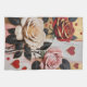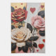 Ein reich strukturiertes und symbolisches Gemälde mit drei großen Rose in tiefroten, sanften Rosa- und cremefarbenen Tönen mit jeweils feinen, dicken Blättern. Die Rose sind von dramatischen dunklen Blätter mit goldenen Adern umgeben. Der Hintergrund ist in drei vertikale Paneele unterteilt: eine ist ein strukturiertes, schimmerndes Gold, die andere ist ein reines, texturiertes Weiß und die letzte ein vertikales Streifen aus texturiertem Weiß und Blassrosa. Die gesamte Komposition ist mit kleinen, glänzenden roten Herzen, die überall verstreut sind, betont. Die Kunstwerke sind luxuriös und dekadent und verbinden natürliche Elemente mit einem kühnen, grafischen und symbolischen Design.