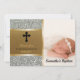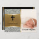Le beau baptême d'argent et d'or ou la photo de baptême vous remercient carde la photo verticale du bébé du côté droit avec le nom du bébé au fond dans le lettrage de manuscrit. L'arrière - plan du côté gauche est les parties scintillantes argentées de faux pour un regard brillant. Lit le "Merci pour partager mon jour spécial" en noir et or avec la date en or. Croix chrétienne au dessus. Le ruban vertical de sembler mince d'or au centre sépare les deux moitiés. Le dos a les frontières métalliques noires assorties de ruban de regard d'arrière - plan et d'or. Note : Toutes les images sont imprimées. Parties scintillantes ou métal non réelles. Élégant, le baptême de bébé vous remercient des cartes du nouveau bébé ou bébé de montrer votre appréciation pour vos invités. Cliquez sur l'option de personnaliser pour changer des couleurs des textes, la taille, et des styles de police. Visitez notre magasin de Zazzle.com/angela65 pour d'autres cartes personnalisées de baptême de photo.