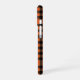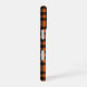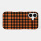 This phone case features a bold orange and black plaid checkered design. Its vibrant colors create a striking look, perfect for adding a touch of personality and seasonal flair to your everyday style.