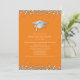 This modern design features a graduation hat and confetti in silver on a background of Orange with white text.
