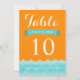 Diese wunderschönen Tischnummern sind mit Ozean und Wellen in Blau mit orangefarbenem Hintergrund gestaltet. Ein elegantes und modernes Design, das sich perfekt für Hochzeiten, Hochzeiten im Wassersport und Hochzeiten in Urlaubsort eignet. Sie können die Textfelder des Beispiels nach Ihren Wünschen anpassen. Weitere passende Einladungen sind ebenfalls verfügbar.
