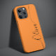 Orange Black Elegant Kalligrafie Script Custom Personalisiert Name iPhone 14 Smart Phone Cases bietet ein modernes und trendy einfaches und stilvolles Design mit Ihrem personalisierten Namen in elegantem handgeschriebenen Kalligraphieskript Typografie auf einem orangen Hintergrund. Entworfen von ©Evco Studio www.zazzle.com/store/evcostudio