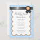 Belles invitations de fête avec un motif damassé bleu et blanc clair et un design ruban noir avec orange en haut.