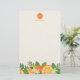 Eine fröhliche orangefarbene Blumenvorlage. Das Design kann mit Ihrer eigenen Nachricht oder Ihrem eigenen Namen personalisiert werden.Die Abbildung enthält handgezeichnet Bilder von Orangen, Scheiben, Blüten von Blume und Blätter in kräftigen Farbtönen wie Orange, Gelb, Grün und Creme.