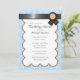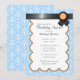 Schöne Party Einladungen mit hellblau-weißem Damast-Muster und schwarzem Band-Design mit Orange oben.
