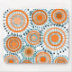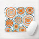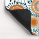 Dieses Mauspad hat ein Muster von Ringen und Kreisen in Orangetönen, wobei hinter ihnen aquamarine Linien kreuzen und Blume auf einem weißen Feld bilden.