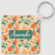 Ein Schlüsselanhänger mit einem Retro-Ambiente. Ein Muster aus geschnitten Orangen, Orangen, grünen Blätter und weißen Blüten.