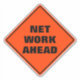 Das sonnige klassisch orangefarbene Karo-Vorsichtsschild warnt vor der Netzarbeit in einem dicken schwarzen serifenlosen Schriftart, was ein Warnzeichen für das Straßenarbeitsschild ist, das als Nächstes auftauchen wird.